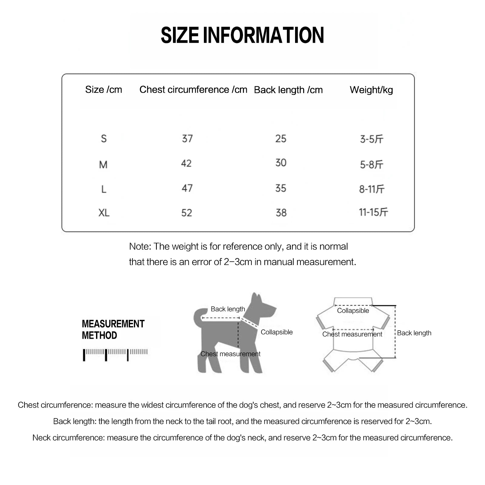 Size,Bust,Back Length,Suitable Weight