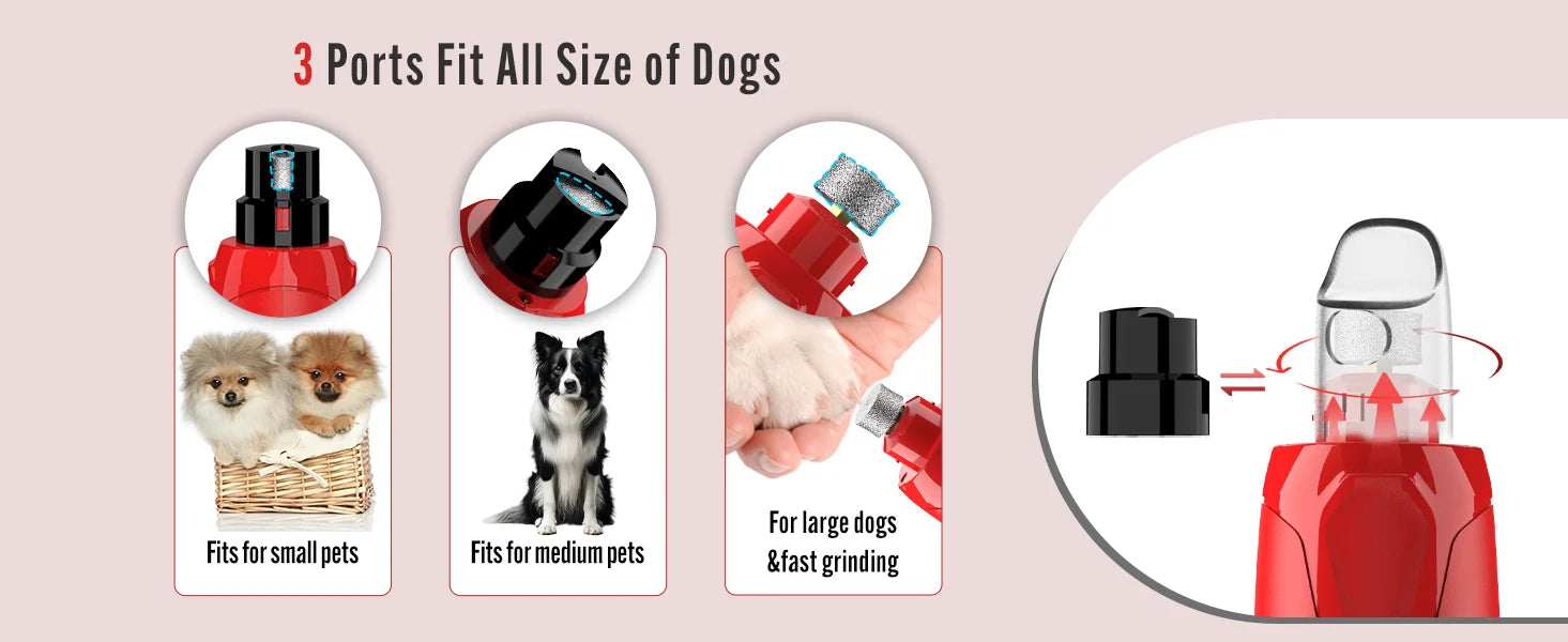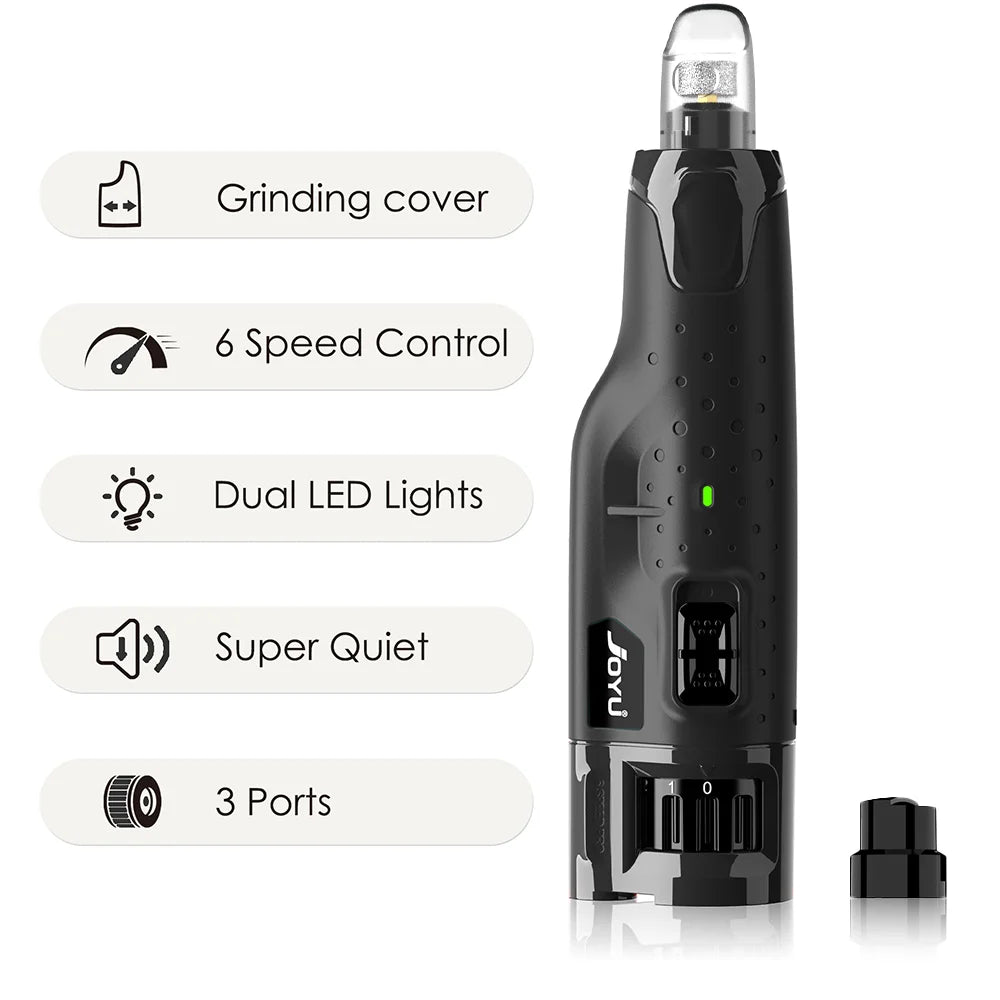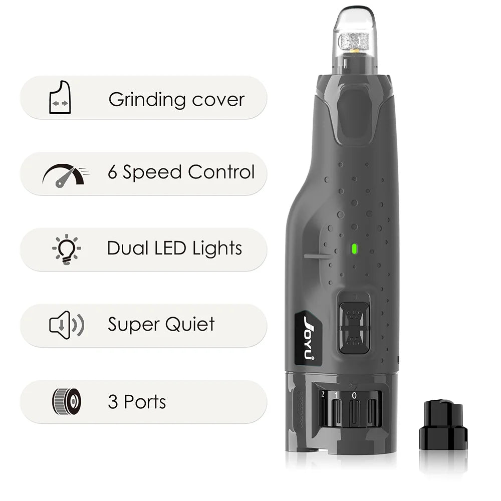 3 Grinding Ports to Groom with Precision and Ease:The Joyu Dog Nail Trimmer features a versatile design with three distinct ports tailored for various pet sizes. The small port is meticulously crafted for the precise grooming needs of smaller pets, ensuring safety and efficiency. The medium port caters to medium-sized animals, offering optimized performance for their nail care requirements. Additionally, an unprotected nail grinder is included.