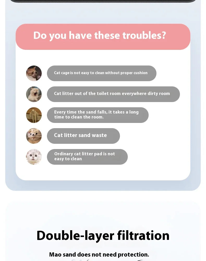 The cushion is very suitable for catching cat litter and for delicate claws. Â Our soft EVA material is very gentle to sensitive cat claws. Â Cats even like to step on it or take a nap in the afternoon. Â The double layer design can filter the cat litter and gather it at the bottom. Â Shake gently to release the litter.