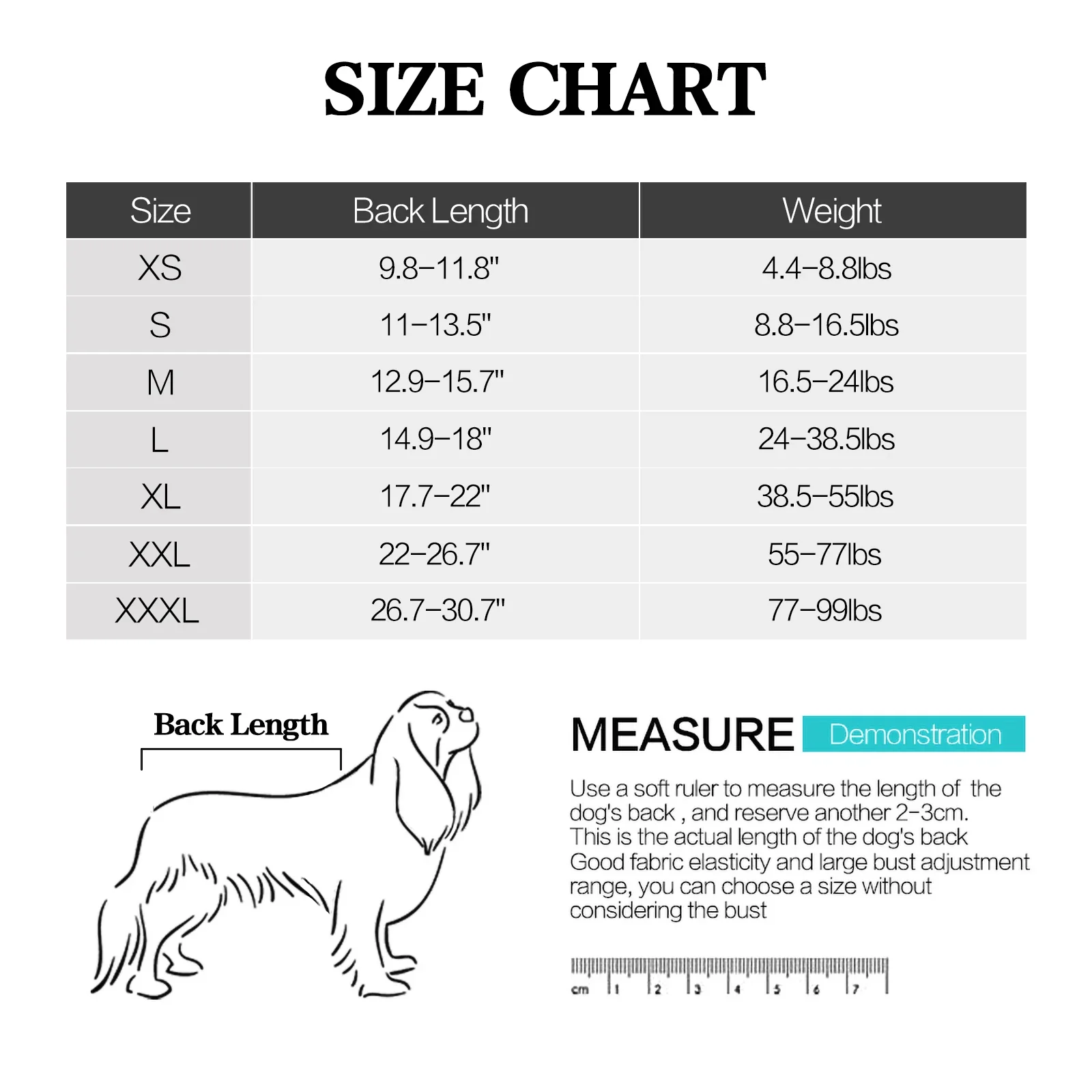 【Comfortable and Keep Calm】Our dog onesie for small,medium and large dogs is made of lightweight, breathable,super stretchy fabric that allows your dog to move with full mobility. The dog onesie applies gentle pressure, making dogs feel more calm and safe.
