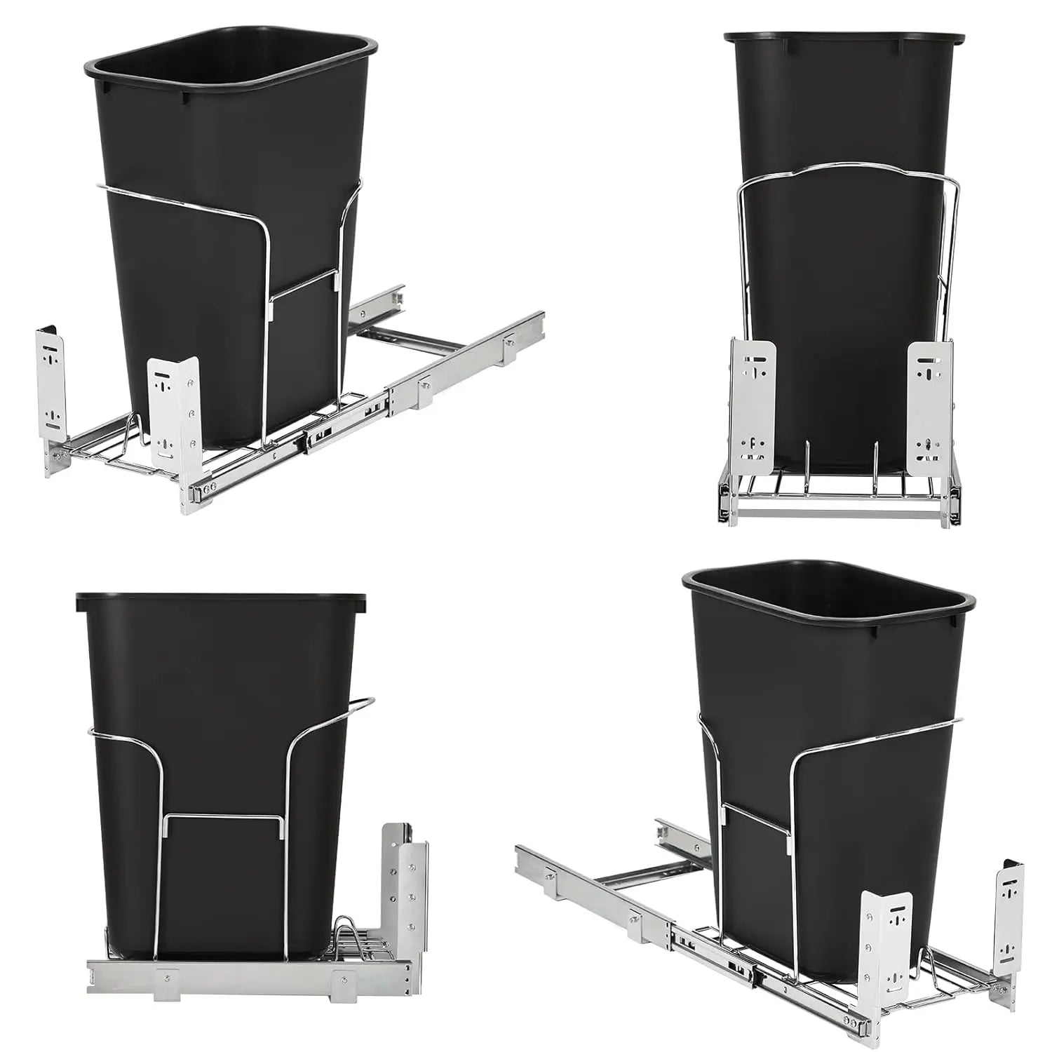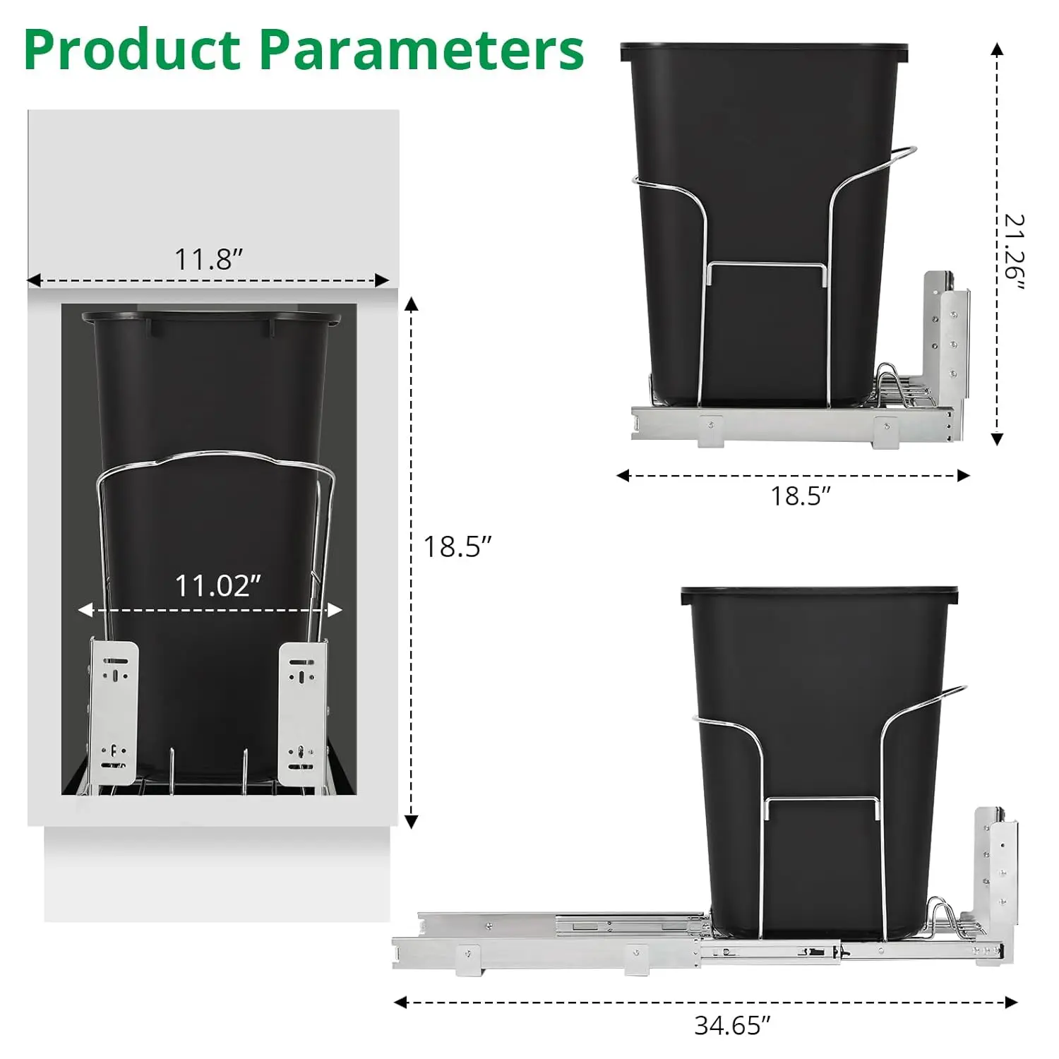 Slides In and Out Quietly Smoothly: The pull out trash cans slides shelf with thickened solid ball bearing system, secure glide with no squeaking noise every time you pull out and push the trash can. Makes garbage collection and disposal easy. In addition, this cabinet trash can holder can also be used for pet food storage, clothing storage, kitchen tool storage, etc.