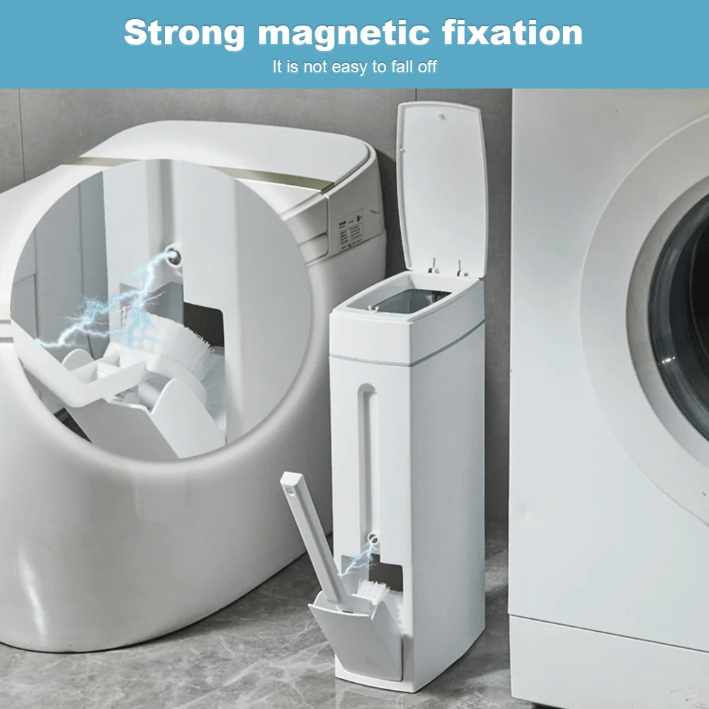 Features: 1.Effective Slim Trash Can: The white bathroom trash can with a lid effectively prevents pets from rummaging through garbage, keeping your home tidy and organized. Its sleek design and compact size make it a sophisticated addition to any room. 2.Superior Sealing Trash Bin: With excellent sealing performance, this slim trash can locks in dust and odors efficiently, ensuring a fresh and pleasant environment at all times. Its modern design enhances any space, whether home or office. 3.Versatile Application Garbage Bin: This plastic waste basket is for various settings, including living rooms, offices, bathrooms, RVs, and bedrooms, offering a touch of elegance and practicality to your decor. 4.Convenient Plastic Waste Basket: The detachable brush holder makes cleaning tasks easier and more efficient, streamlining your maintenance routine while maintaining cleanliness and sanitation. 5.Space-Saving Bathroom Trash Can: The foldable and concealable bathroom brush fits neatly inside the garbage bin, maximizing storage space and promoting a neat and sanitary bathroom environment. Specification: Origin: Mainland China Product Size: 419.00x203.00x108.00mm/16.5x8.0x4.3inch Material: PP+ABS