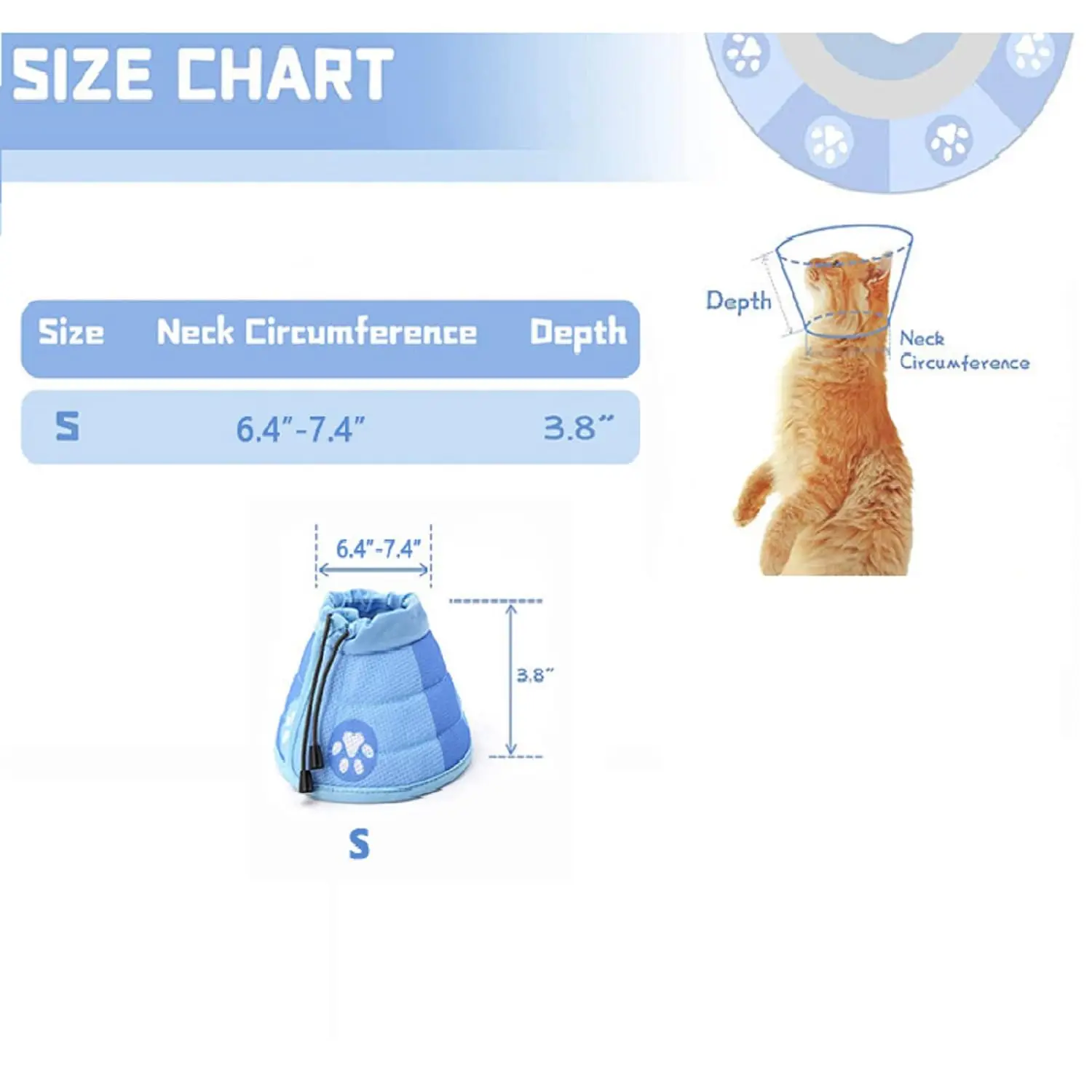 Neck circumference 6.4”-7.4”, depth 3.8”. Drawstring tightens to prevent slipping, while strong velcro ensures a secure fit. Works for kittens, puppies, and small dogs—no need to buy multiple sizes.