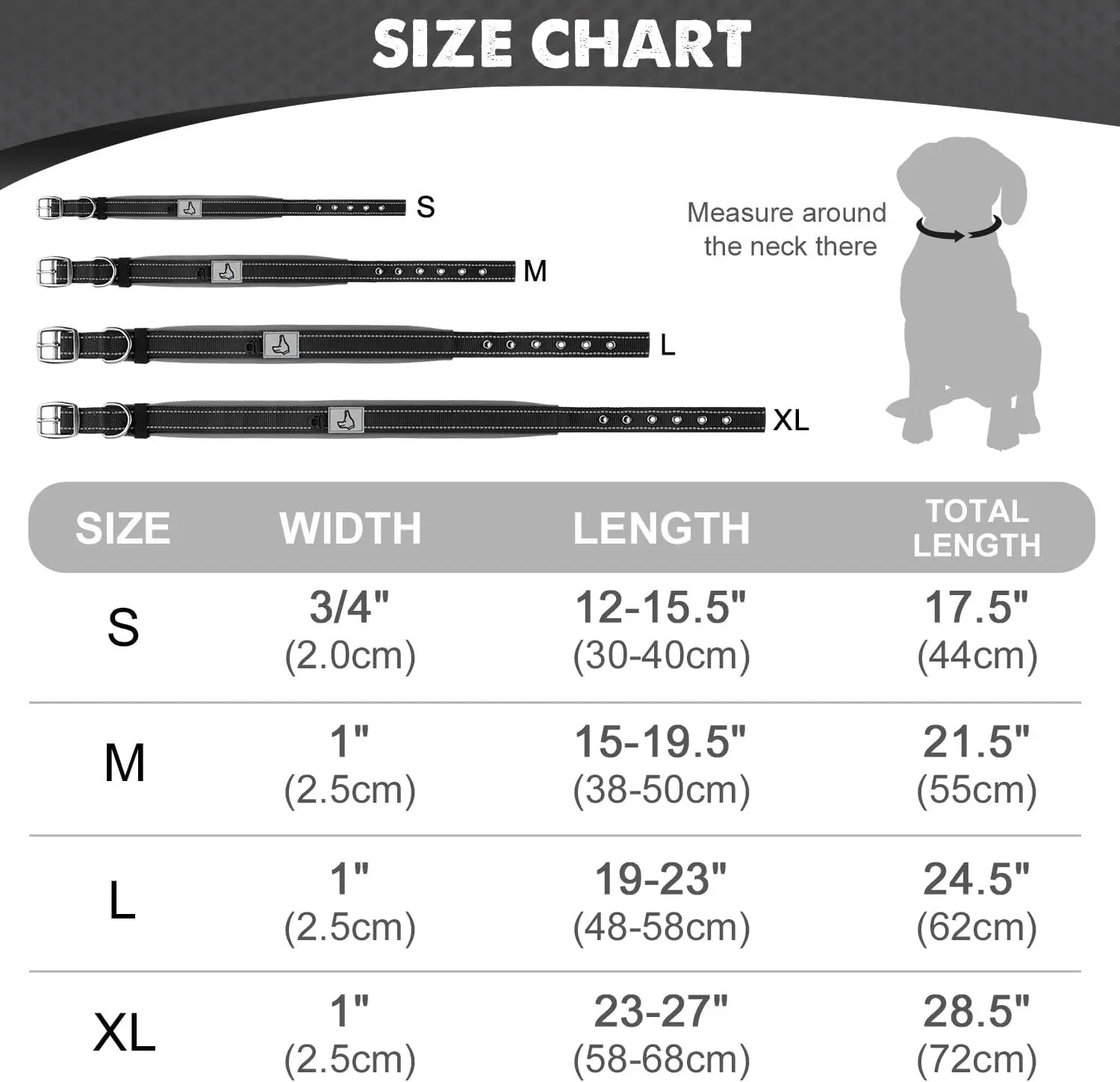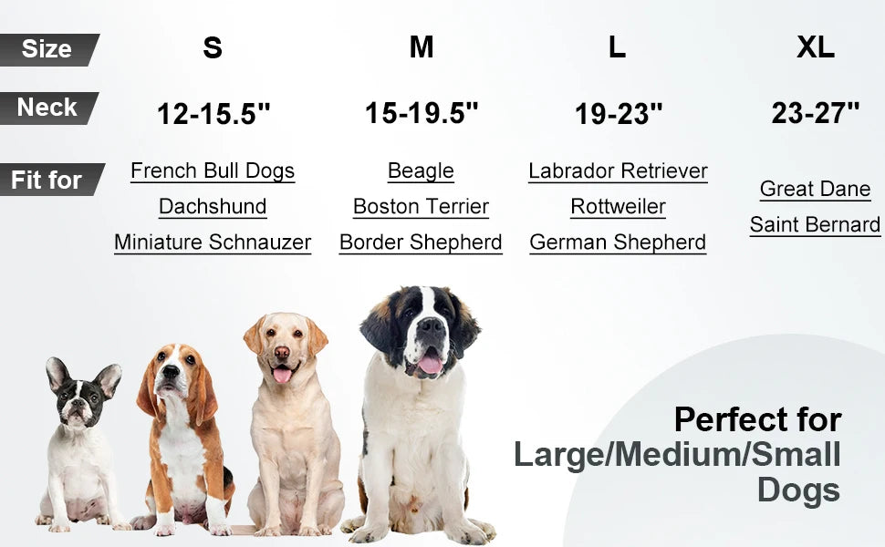 Size Attention - Make sure to measure your dog’s neck before placing an order. Then refer to the sizing chart: Small 11" – 14.5" | Medium 14.5" - 19" | Large 19" - 23" | X-Large 23" - 27" |. DON'T CHOOSE SIZE BY WEIGHT AND BREEDS ONLY. Dog collar should be snug enough to fit two fingers between the dog's neck & collar