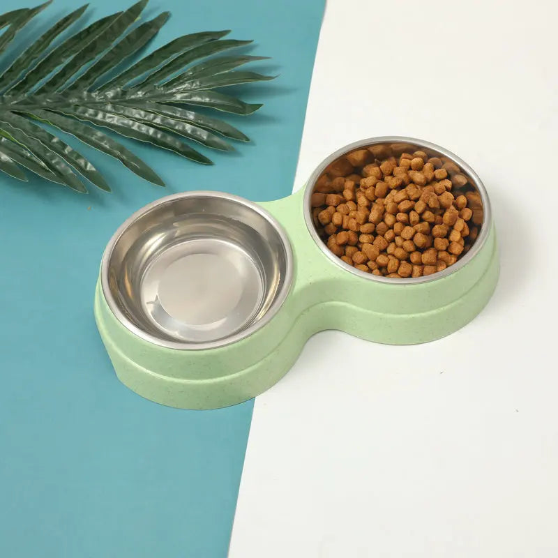 Stainless Steel Double Pet Bowl Wheat Straw Base Dog Cats Feeder Cat Puppy Feeding Food Water Container Dispenser Pet Supplies