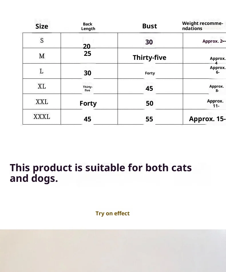 size: S size [about 2-3 pounds], M size [about 3-5 pounds], L size [about 5-7 pounds], XL size [about 7-10 pounds], XXL size [about 10-14 pounds], XXXL size [about 14-17 pounds]
